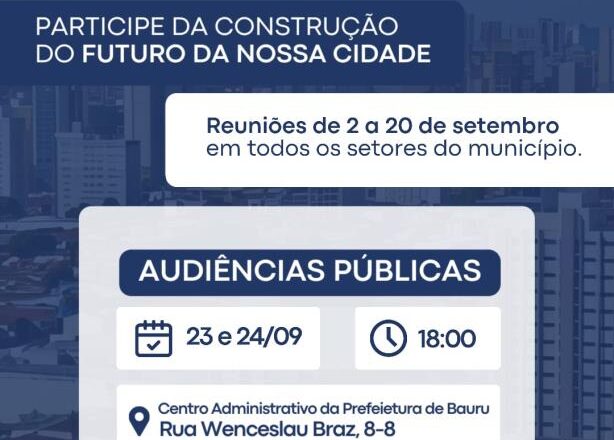 Já as audiências públicas finais serão nos dias 23 e 24 de setembro, com início às 18h, no Centro Administrativo da prefeitura, abertas para a participação presencial de toda a população e com transmissão ao vivo no YouTube da prefeitura. A audiência do dia 23 de setembro vai apresentar a proposta preliminar da minuta da revisão do Plano Diretor, e a audiência do dia 24 de setembro vai apresentar a proposta preliminar da minuta da nova LUOS. As minutas serão elaboradas como resultados dos trabalhos desenvolvidos até então. Em seguida, após passarem por adequações, caso necessário, os projetos deverão ser enviados para a Câmara Municipal.