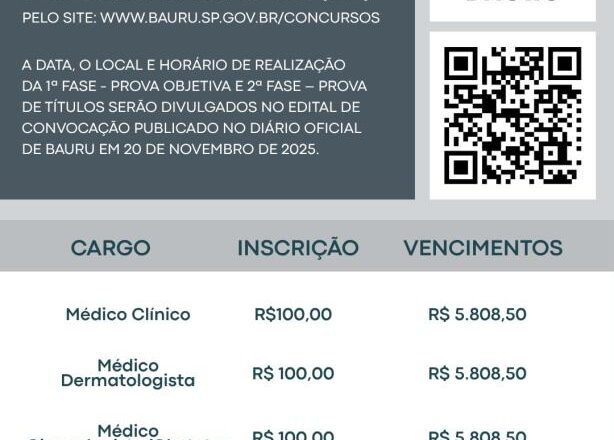A Prefeitura de Bauru, por meio da Secretaria da Administração, encerra as inscrições de cinco concursos públicos para cargos de médico nesta segunda-feira (03/11), às 16h. Os concursos são para os cargos de médico clínico (edital 13/2025) médico dermatologista (edital 14/2025), médico emergencista (edital 15/2025), médico ginecologista/obstetra (edital 16/2025) e médico psiquiatra (edital 17/2025), conforme informações a seguir.