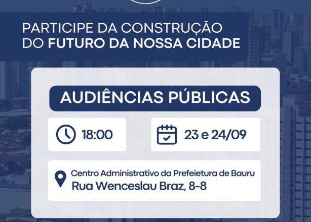 A Prefeitura de Bauru, através da Secretaria de Aprovação de Projetos, realiza as audiências públicas finais da revisão do Plano Diretor e da Lei de Uso e Ocupação de Solo (LUOS) nesta terça-feira (23) e quarta-feira (24), às 18h. As audiências serão no Centro Administrativo da prefeitura, na rua Wenceslau Braz, 8-8, abertas para a participação de toda a população, e também serão transmitidas pelo YouTube da prefeitura.