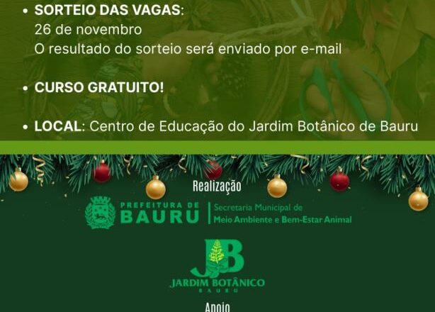 Os interessados devem fazer a pré-inscrição até terça-feira (25), no site www.jardimbotanicobauru.com.br. Caso o número de pré-inscritos ultrapasse o limite das 15 vagas disponíveis, será realizado um sorteio, na quarta-feira (26), com o Jardim Botânico enviando o resultado do sorteio por e-mail a todos os pré-inscritos. O curso será gratuito e o Jardim Botânico vai fornecer todos os materiais necessários. A oficina é voltada para pessoas com 18 anos ou mais, e será no auditório do Centro de Educação Ambiental do Jardim Botânico.