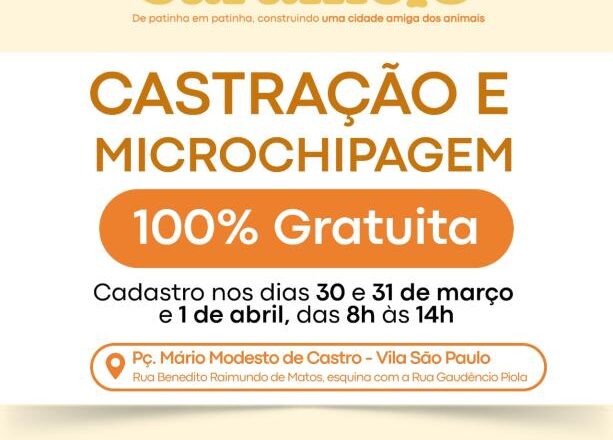 As castrações são para cães e gatos, machos e fêmeas, e serão realizadas de 9 a 12 de abril, em uma unidade móvel na Praça Mário Modesto de Castro. Além da castração, os animais receberão um microchip.