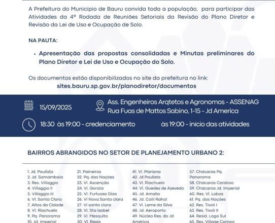 A Prefeitura de Bauru, através da Secretaria de Aprovação de Projetos, realiza a reunião setorial da revisão do Plano Diretor e da Lei de Uso e Ocupação de Solo (LUOS) no Setor 2 nesta segunda-feira (15). O credenciamento será às 18h30, com o início da reunião às 19h, na Assenag, na rua Fuas de Mattos Sabino, 1-15, no Jardim América.