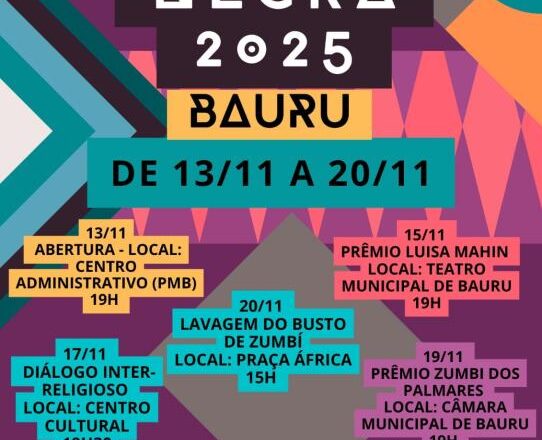O Conselho da Comunidade Negra de Bauru realiza a abertura da Semana da Consciência Negra nesta quinta-feira (13). O evento conta com o apoio da Prefeitura de Bauru, por meio da Secretaria de Cultura, e segue até o dia 20 de novembro. A programação deste ano conta com diversas atividades que destacam o protagonismo da comunidade negra e serão realizadas em diferentes pontos do município.