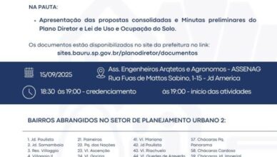 Reunião da revisão do Plano Diretor será no Setor 2 na segunda-feira 15 de setembro de 202514 de setembro de 2025O Cidadão Bauruense A Prefeitura de Bauru, através da Secretaria de Aprovação de Projetos, realiza a reunião setorial da revisão do Plano Diretor e da Lei [...]