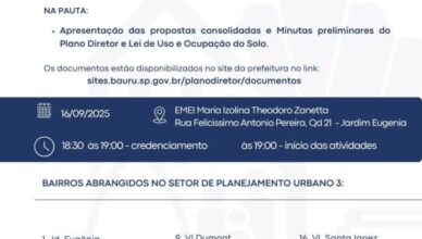 Reunião da revisão do Plano Diretor será no Setor 3 na terça-feira 16 de setembro de 202515 de setembro de 2025O Cidadão Bauruense A Prefeitura de Bauru, através da Secretaria de Aprovação de Projetos, realiza a reunião setorial da revisão do Plano Diretor e da Lei [...]